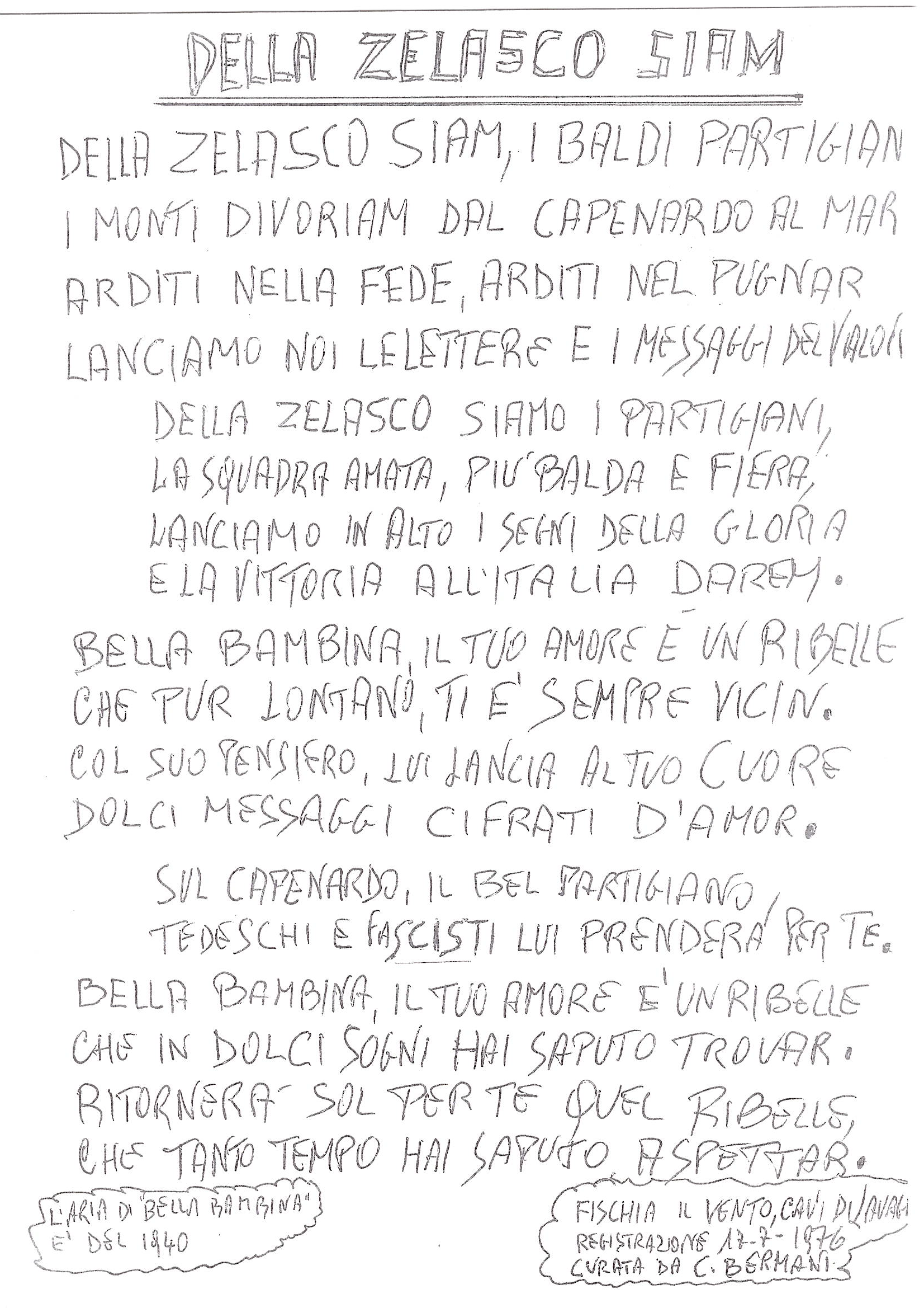 Il fotografo del Comune volle riprendere il testo della canzone e la documentazione che avevo preparato sull’argomento per rispondere alle eventuali domande che fossero poste e che riporto più sotto.