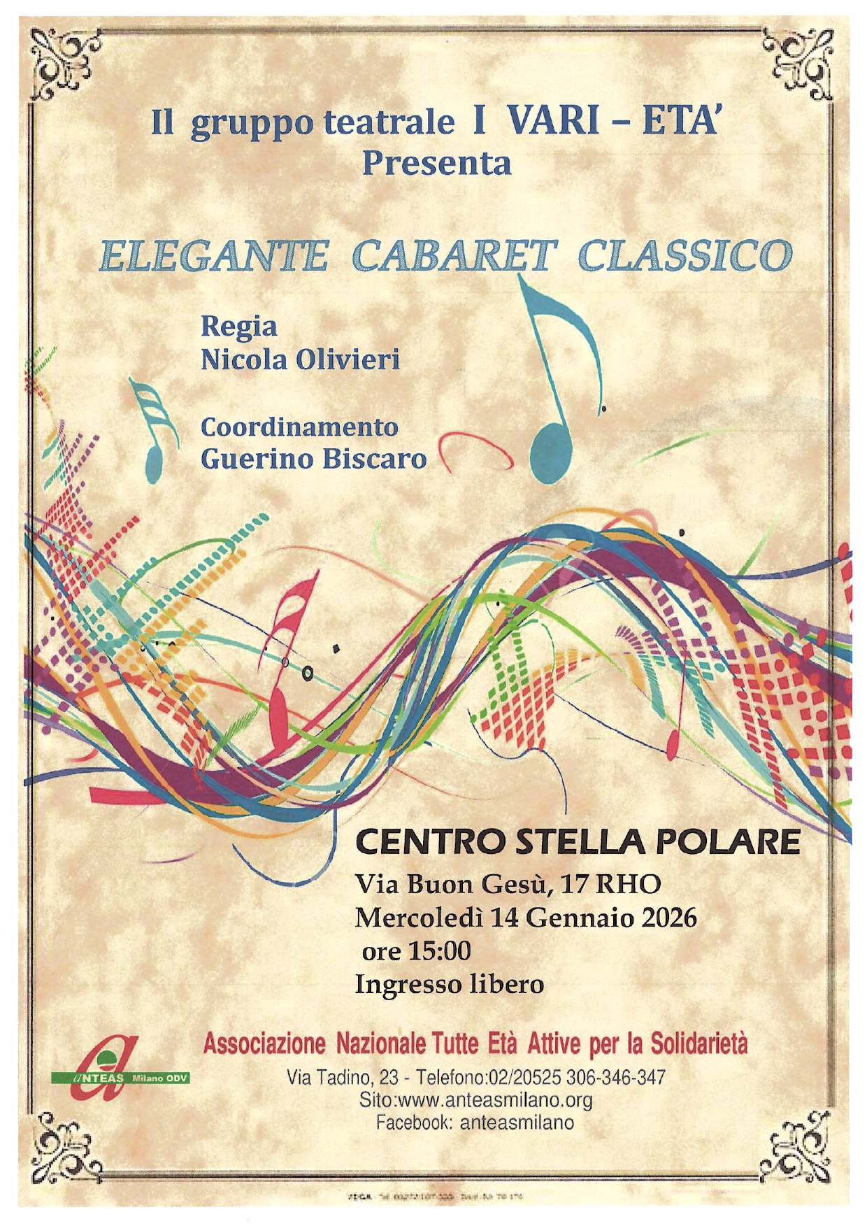 Mercoledì 14 gennaio 2026 il Gruppo Teatrale I VARI-ETA’ si è esibito davanti ai numerosi frequentatori del Centro Stella Polare di Rho con un cabaret classico e culturale molto vario e interessante composto alternativamente da siparietti musicali con la vocalist Giuliana Fantoni accompagnata alla chitarra da Giorgio Pinello, di prosa e poesia e con innesti relativi alla memoria storica per merito del noto giornalista Pietro Roncato. Oltre al merito organizzativo va ricordato anche il continuo e paziente lavoro di formazione e regia dell’artista Nicola Olivieri al quale tutto il Gruppo ne riconosce la validità.